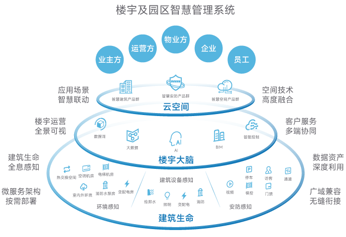 基于云、管、边、端架构的建筑物联网,横向整合楼控、安防、消防、能源、环境等软硬件系统,纵向打通终端设备、边缘网关、业务中台、云端应用,帮助客户构建具有广泛接入能力、可灵活伸缩扩展的全息感知平台。